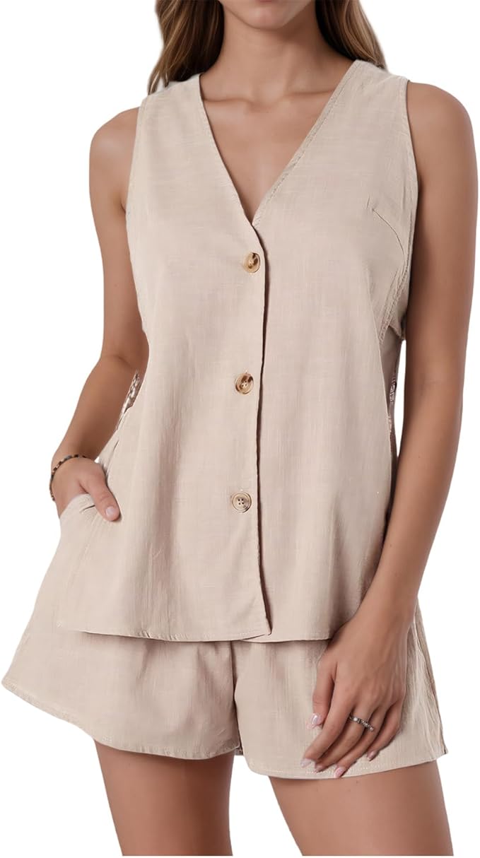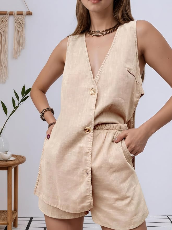 - MATERIAL:Women’s sleeveless button down linen v neck vest waistcoat and shorts,made with high-quality materials, this 2 piece set is designed for both style and comfort.This summer suit offers a soft and comfortable feel, and the loose fit design is suitable for most figures
