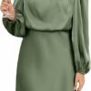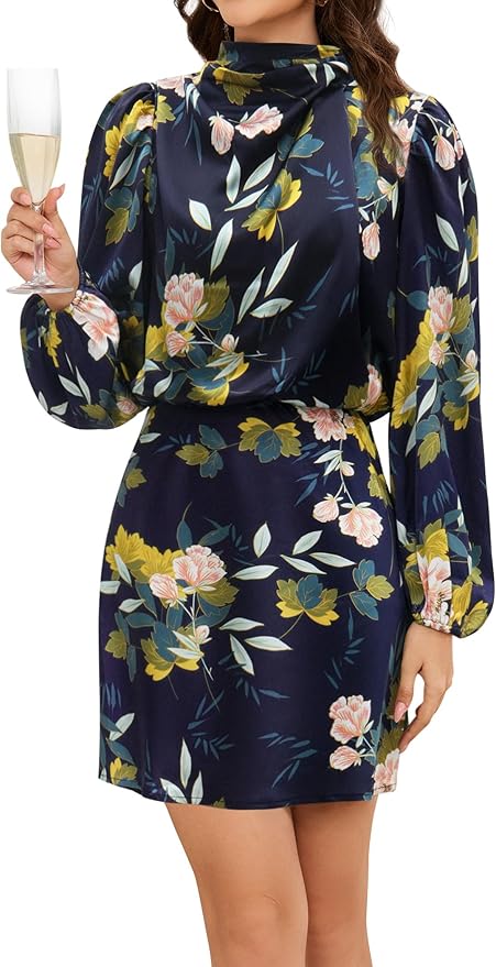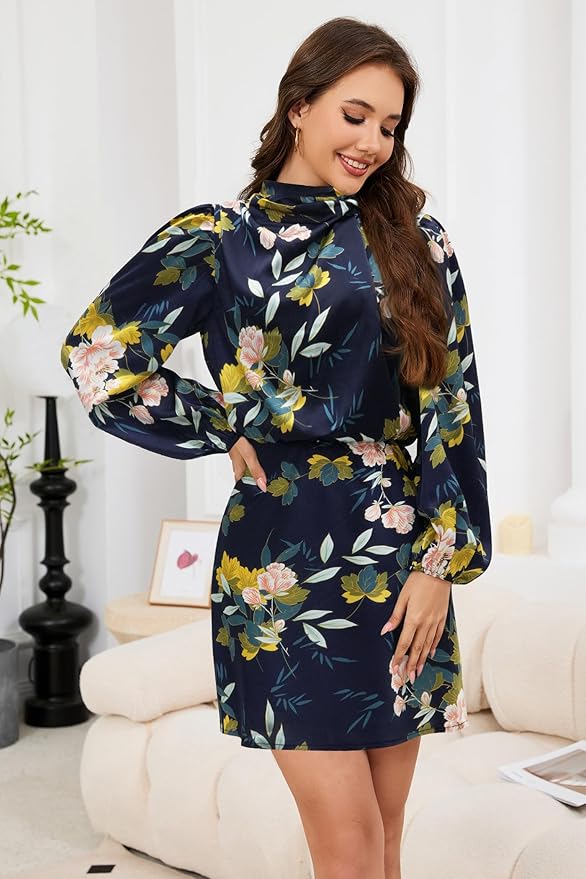 Womens elegant long sleeve satin mini dress made of selected satin material, light weight and comfortable. Formal high neck satin short dresses for women with non-stretch fabric, silky smooth to wear and looks striking, flattering and textured.