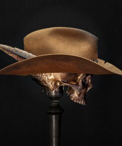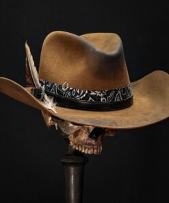 This Tennessee Teardrop European Hare in Whiskey has a sharp cowboy curl. Wrapped in black paisley fabric and an embossed black leather strap with silver buckle. Finished with a silver horseshoe and large feather detail.