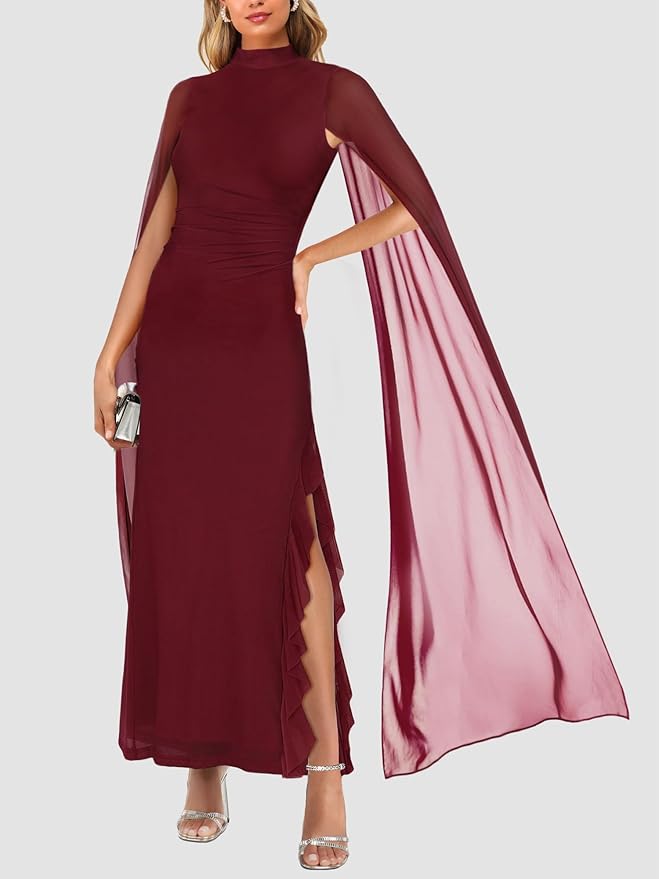 - Features: Stretch, lightweight, thin, breathable, soft sheer mesh see through fabric with lined, elegant dress long sleeve, flowing cape sleeve design, side high slit with ruffle dress, sexy high neck dress, waist mesh ruched design, back zipper closure, formal party dress, maxi long dress, ruched bodycon dress, womens ruffle dress, long maxi dres,women elegant prom dress,spring date night outfits bodycon dresses