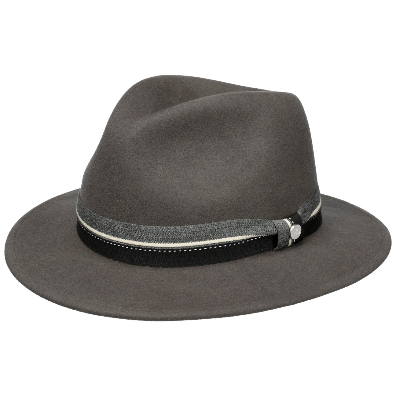 Plain-coloured wool felt gives this traveller hat a smooth feel, which is completely unaffected by the vagaries of the weather. The felt hat keeps rain showers at bay with its water-repellent finish, while you get to enjoy shade under the brim when the sun is shining. Even crumpling does not impair the beauty of this outdoor hat with colour-coordinated leather trim.