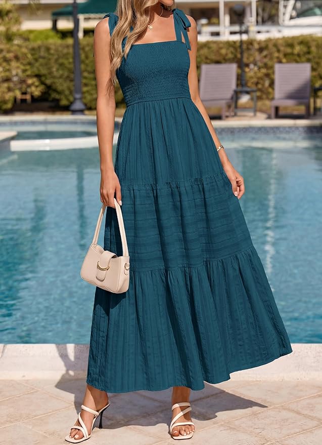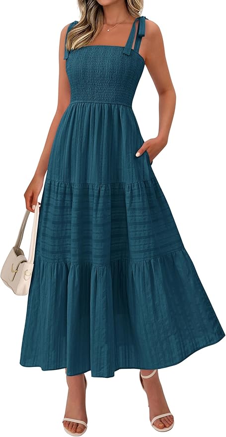 - This Boho Maxi Dress Charge for Exquisite Small Hollow Out Lightweight Fabric and Tie Shoulder Strap, Shirred Stretchy Bodice Smocked Dress with Lining, for Light Color Dress, Please Go for Nude or Beige Underwear to Keep Things Discreet