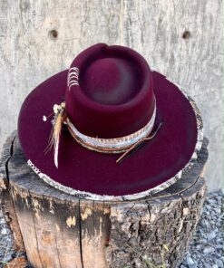“Mulled Wine Vintage Felt Wide Brim Hat” is hand-distressed, hand-dyed, and hand-torched, ensuring no two share the same color or design. Each piece is uniquely imperfect, with subtle variations from product images.
