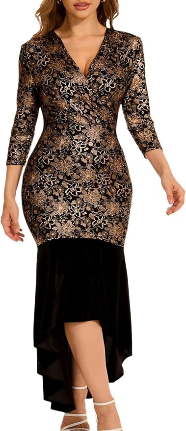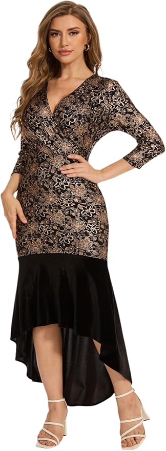 - Embroidery and sequin crafted fabric, sparkling, easily attracts attention and becomes the focus of the party. Ruffle hemline, elegant and formal.