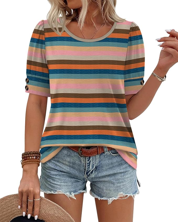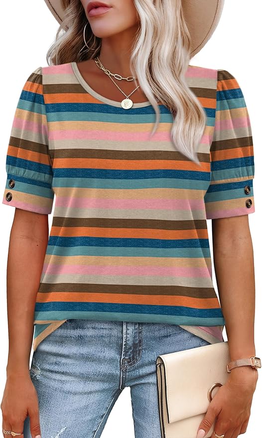- Loose Fit: This stylish top features a flowy, comfortable fit with button-accented short sleeves for a touch of elegance. Offering flattering coverage, it’s a perfect choice for year-round wear