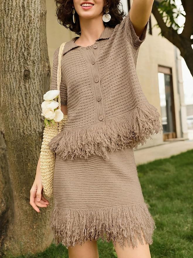 - Trendy Fringe Suits: The matching skirt sets showcases a fringe design that adds movement and flair, making the set ideal for both relaxed and slightly dressier casual occasions.