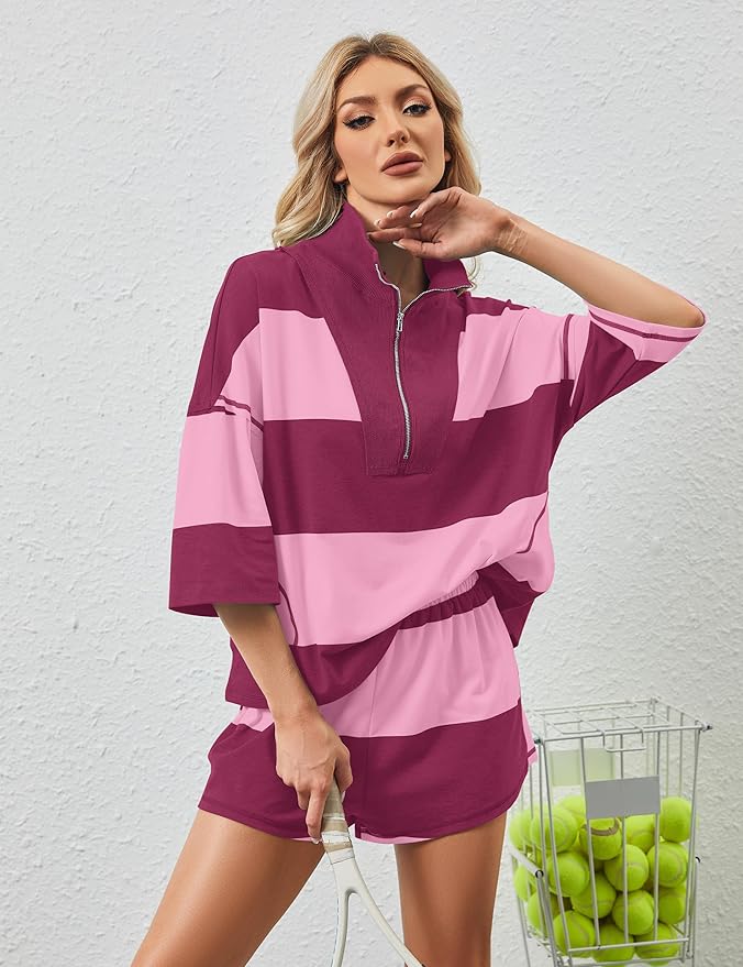 - Features:Matching workout sets for women,two piece shorts sets for women,summer striped pajamas set,striped drop shoulder tops,elastic waist shorts,women trendy shorts sets,womens sets 2 piece outfits going out